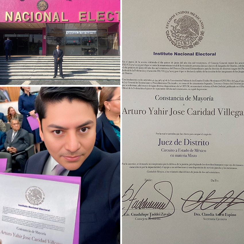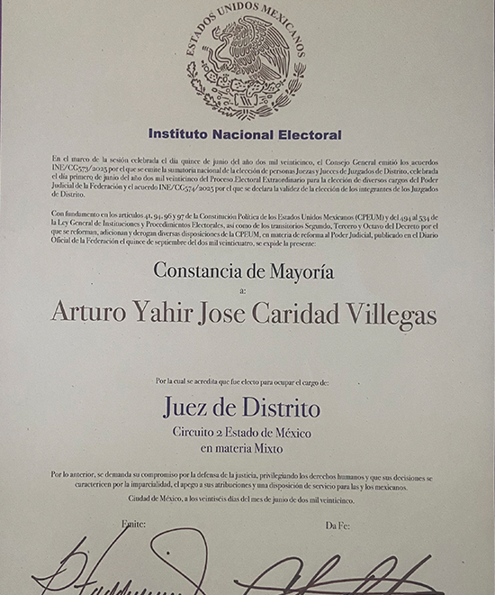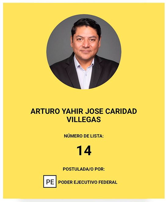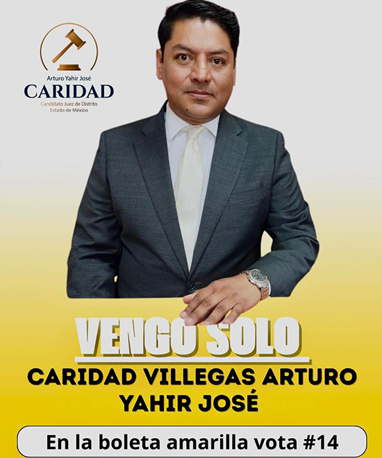 El Juez Electo Arturo Yahir José Caridad Villegas, desde el 2002, ha prestado sus servicios profesionales en el sector privado como abogado de diversas firmas de abogados y empresas, fue asesor jurídico en la Secretaria de Agricultura de 2006 a 2012, desde 2013 es director general del despacho DEIKAR ABOGADOS, S.A.S DE C.V., es especialista en materia familiar, civil, laboral, amparo y mercantil, ha realizado cursos y diplomados en Violencia Familiar, Derecho del Trabajo y juicios en línea, ha colaborado con asociaciones Civiles para brindar asesoría jurídica a personas de escasos recursos, ha prestado sus servicios jurídicos pro bono, es decir de forma gratuita, en beneficio de los más vulnerables.